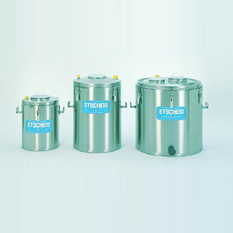 The elegant ETSCHEID courtyard containers are double-walled, made entirely of chrome-nickel steel, with CFC-free insulation. They have no reinforcement rings and are therefore easy to clean. The models BI 100 to 190 are vacuum-tight. The lid is available with one or two openings: for the immersion cooler, for manual milk removal or the milk inlet sheet. The milk inlet elbow is welded onto the lid with an opening as standard. The lid is fastened with toggle locks. Lids with hinges are also available on request from BI 250.